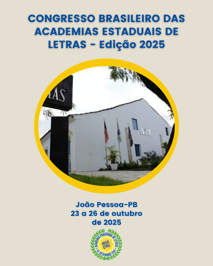 APL REALIZA CONGRESSO DAS ACADEMIAS A Academia Paraibana de Letras promove, entre os dias 23 a 26 de outubro, o Congresso Brasileiro das Academias Estaduais de Letras – 2025. O evento integra as atividades do Fórum Brasileiro das Academias Estaduais de Letras, que “representa, une, fortalece, fomenta e estabelece uma conexão entre as entidades e […]
